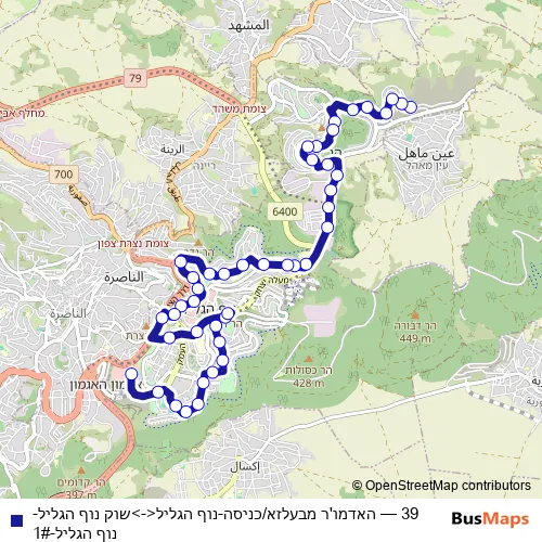 The first stop of the 39 bus route is האדמו'ר מבעלזא/כניסה and the last stop is שוק נוף הגליל. 39 (האדמו'ר מבעלזא/כניסה-נוף הגליל<->שוק נוף הגליל-נוף הגליל-1#) is operational during כל יום.