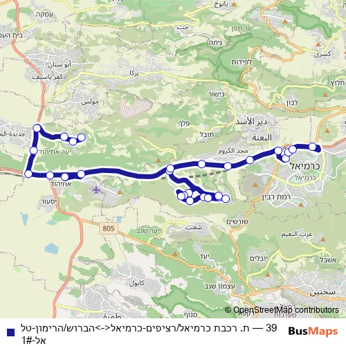 The first stop of the 39 bus route is הברוש/הרימון and the last stop is ת. רכבת כרמיאל. 39 (ת. רכבת כרמיאל/רציפים-כרמיאל<->הברוש/הרימון-טל אל-1#) is operational during כל יום.