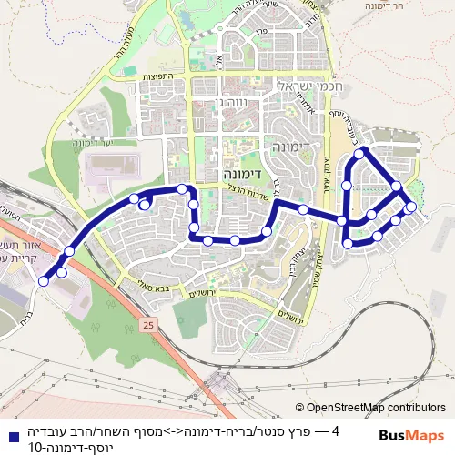 See why over 2 million users trust and consider busmaps.com as the best public transport website. busmaps gives you Dimona Buses suggested routes, real-time bus tracker, line route maps in Dimona, and helps to find the closest 4 bus stops near you. No internet available? Download an offline PDF map and bus schedule for the 4 bus to take on your trip.