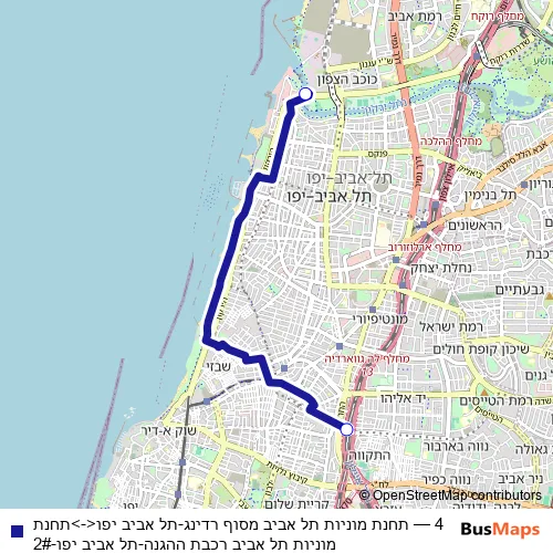 Services on the 4 - תחנת מוניות תל אביב מסוף רדינג-תל אביב יפו<->תחנת מוניות תל אביב רכבת ההגנה-תל אביב יפו-2# bus stop at 16:25 on יום שני, יום שלישי, יום רביעי, יום חמישי, יום שישי, יום ראשון.