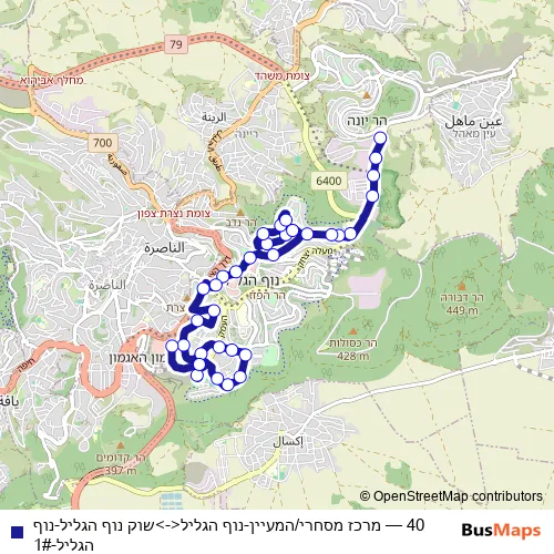 The first stop of the 40 bus route is מרכז מסחרי/המעיין and the last stop is שוק נוף הגליל. 40 (מרכז מסחרי/המעיין-נוף הגליל<->שוק נוף הגליל-נוף הגליל-1#) is operational during כל יום.