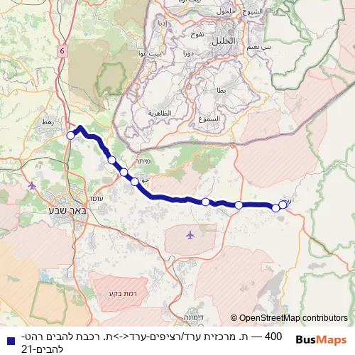 Services on the 400 - ת. מרכזית ערד/רציפים-ערד<->ת. רכבת להבים רהט-להבים-21 bus stop at 06:51 on יום שני, יום שלישי, יום רביעי, יום חמישי, יום ראשון.
