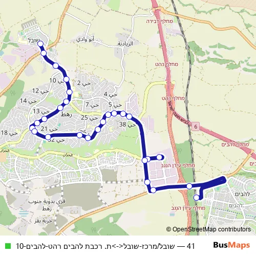 The first stop of the 41 bus route is שובל/מרכז and the last stop is ת. רכבת להבים רהט. 41 (שובל/מרכז-שובל<->ת. רכבת להבים רהט-להבים-10) is operational during כל יום.
