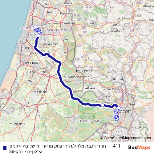 Services on the 411 - חניון רכבת מלחה/דרך יצחק מודעי-ירושלים<->קניון איילון-בני ברק-36 bus stop at 00:56 +1 on יום שני, יום שלישי, יום רביעי, יום חמישי, יום שישי, יום שבת, יום ראשון.