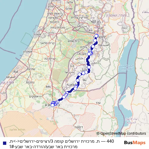 The first stop of the 440 bus route is ת. מרכזית ירושלים קומה 3/רציפים and the last stop is ת.מרכזית באר שבע/הורדה. 440 (ת. מרכזית ירושלים קומה 3/רציפים-ירושלים<->ת.מרכזית באר שבע/הורדה-באר שבע-1#) is operational during כל יום.