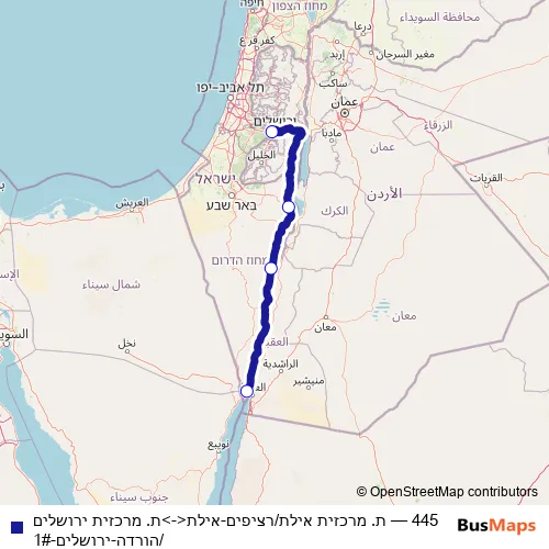 The first stop of the 445 bus route is ת. מרכזית ירושלים קומה 3/רציפים and the last stop is ת. מרכזית אילת/הורדה. 445 (ת. מרכזית אילת/רציפים-אילת<->ת. מרכזית ירושלים/הורדה-ירושלים-1#) is operational during כל יום.