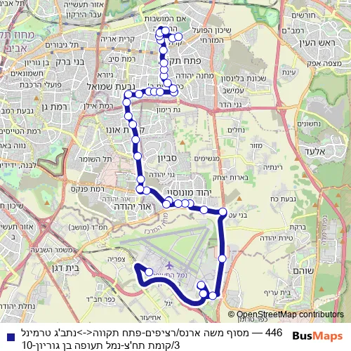 The first stop of the 446 bus route is נתב'ג טרמינל 3/קומת תח'צ and the last stop is מסוף משה ארנס/הורדה. 446 (מסוף משה ארנס/רציפים-פתח תקווה<->נתב'ג טרמינל 3/קומת תח'צ-נמל תעופה בן גוריון-10) is operational during כל יום.