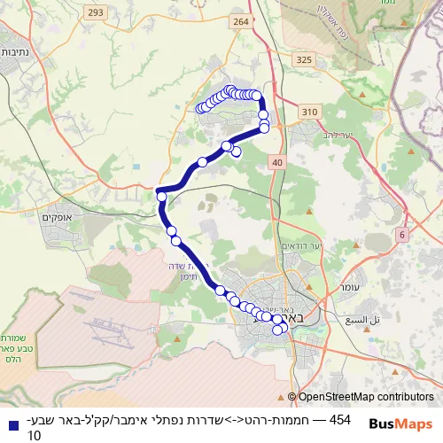 The first stop of the 454 bus route is חממות and the last stop is שדרות נפתלי אימבר/קק'ל. 454 (חממות-רהט<->שדרות נפתלי אימבר/קק'ל-באר שבע-10) is operational during כל יום.