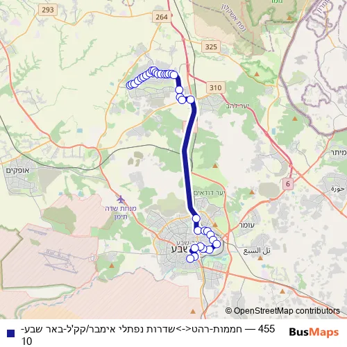 The first stop of the 455 bus route is חממות and the last stop is שדרות נפתלי אימבר/קק'ל. 455 (חממות-רהט<->שדרות נפתלי אימבר/קק'ל-באר שבע-10) is operational during כל יום.