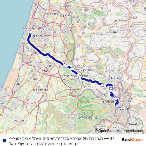 The first stop of the 471 bus route is ת.רכבת תל אביב - סבידור/רציפים B and the last stop is ת. מרכזית ירושלים/הורדה. 471 (ת.רכבת תל אביב - סבידור/רציפים B-תל אביב יפו<->ת. מרכזית ירושלים/הורדה-ירושלים-1#) is operational during כל יום.