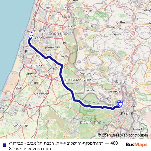 The first stop of the 480 bus route is רמות/מסוף and the last stop is ת. רכבת תל אביב - סבידור/הורדה. 480 (רמות/מסוף-ירושלים<->ת. רכבת תל אביב - סבידור/הורדה-תל אביב יפו-31) is operational during כל יום.