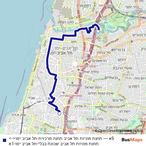 The first stop of the 5א bus route is תחנת מוניות תל אביב שכונת בבלי and the last stop is תחנת מוניות תל אביב תחנה מרכזית. 5א (תחנת מוניות תל אביב תחנה מרכזית-תל אביב יפו<->תחנת מוניות תל אביב שכונת בבלי-תל אביב יפו-1א) is operational during כל יום.