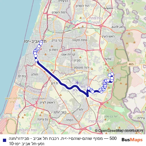 The first stop of the 500 bus route is ת. רכבת תל אביב- סבידור/רציפים A and the last stop is מסוף שוהם. 500 (מסוף שוהם-שוהם<->ת. רכבת תל אביב - סבידור/חנה וסע-תל אביב יפו-10) is operational during כל יום.