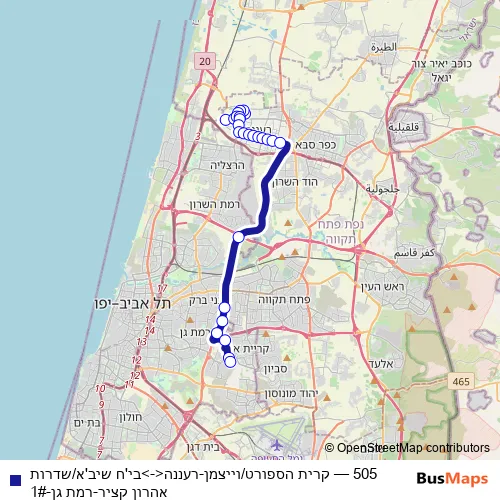 The first stop of the 505 bus route is קרית הספורט/וייצמן and the last stop is בי'ח שיב'א/שדרות אהרון קציר. 505 (קרית הספורט/וייצמן-רעננה<->בי'ח שיב'א/שדרות אהרון קציר-רמת גן-1#) is operational during כל יום.