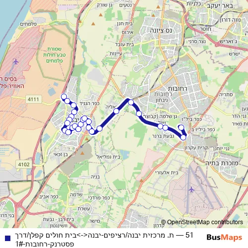The first stop of the 51 bus route is ת. מרכזית יבנה/רציפים and the last stop is בית חולים קפלן/דרך פסטרנק. 51 (ת. מרכזית יבנה/רציפים-יבנה<->בית חולים קפלן/דרך פסטרנק-רחובות-1#) is operational during כל יום.