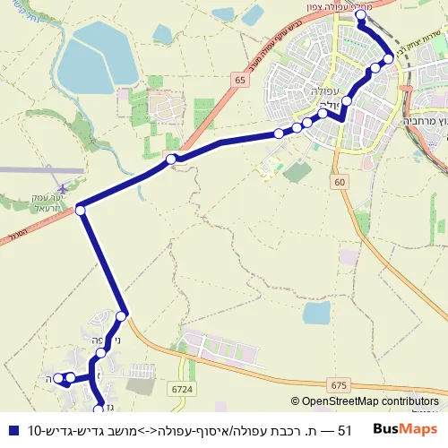The first stop of the 51 bus route is ת. רכבת עפולה/איסוף and the last stop is מושב גדיש. 51 (ת. רכבת עפולה/איסוף-עפולה<->מושב גדיש-גדיש-10) is operational during כל יום.