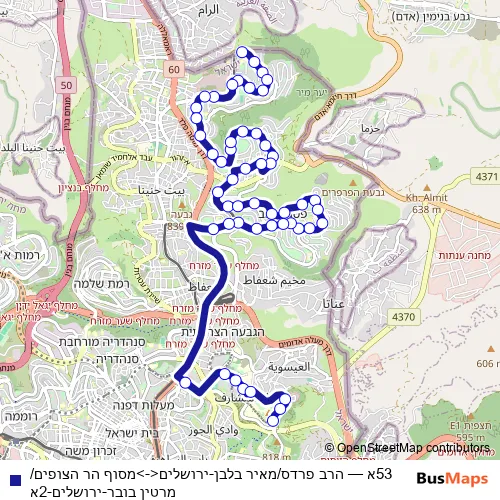 The first stop of the 53א bus route is הרב פרדס/מאיר בלבן and the last stop is מסוף הר הצופים/מרטין בובר. 53א (הרב פרדס/מאיר בלבן-ירושלים<->מסוף הר הצופים/מרטין בובר-ירושלים-2א) is operational during כל יום.