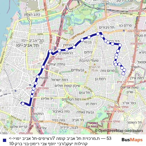 The first stop of the 53 bus route is ת.מרכזית תל אביב קומה 7/רציפים and the last stop is קהילות יעקב/רבי יוסף צבי רימון. 53 (ת.מרכזית תל אביב קומה 7/רציפים-תל אביב יפו<->קהילות יעקב/רבי יוסף צבי רימון-בני ברק-10) is operational during כל יום.