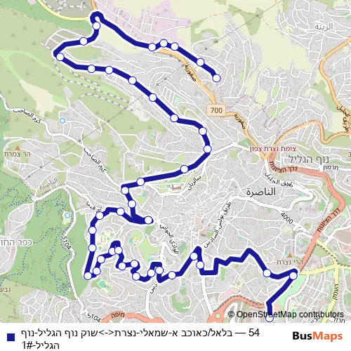 The first stop of the 54 bus route is בלאל/כאוכב א-שמאלי and the last stop is שוק נוף הגליל. 54 (בלאל/כאוכב א-שמאלי-נצרת<->שוק נוף הגליל-נוף הגליל-1#) is operational during כל יום.
