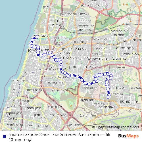 The first stop of the 55 bus route is מסוף רדינג/רציפים and the last stop is מסוף קרית אונו. 55 (מסוף רדינג/רציפים-תל אביב יפו<->מסוף קרית אונו-קרית אונו-10) is operational during כל יום.