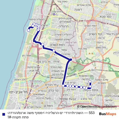The first stop of the 553 bus route is מסוף משה ארנס/רציפים and the last stop is השונית/יורדי ים. 553 (השונית/יורדי ים-הרצליה<->מסוף משה ארנס/הורדה-פתח תקווה-1#) is operational during כל יום.