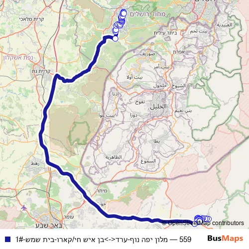 The first stop of the 559 bus route is מלון יפה נוף and the last stop is בן איש חי/קארו. 559 (מלון יפה נוף-ערד<->בן איש חי/קארו-בית שמש-1#) is operational during כל יום.