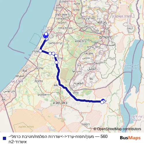 The first stop of the 560 bus route is מעון/תפוח and the last stop is שדרות הפלמח/חטיבת כרמלי. 560 (מעון/תפוח-ערד<->שדרות הפלמח/חטיבת כרמלי-אשדוד-2ח) is operational during כל יום.