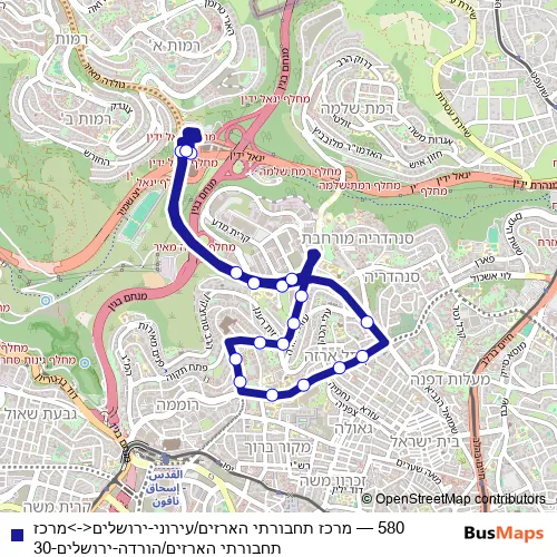 See why over 2 million users trust and consider busmaps.com as the best public transport website. busmaps gives you Jerusalem Buses suggested routes, real-time bus tracker, line route maps in Jerusalem, and helps to find the closest 580 bus stops near you. No internet available? Download an offline PDF map and bus schedule for the 580 bus to take on your trip.
