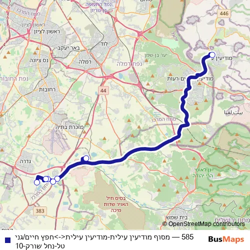The first stop of the 585 bus route is מסוף מודיעין עילית and the last stop is חפץ חיים/גני טל. 585 (מסוף מודיעין עילית-מודיעין עילית<->חפץ חיים/גני טל-נחל שורק-10) is operational during כל יום.