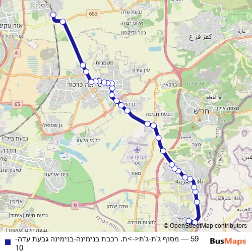 The first stop of the 59 bus route is מסוף ג'ת and the last stop is ת. רכבת בנימינה. 59 (מסוף ג'ת-ג'ת<->ת. רכבת בנימינה-בנימינה גבעת עדה-10) is operational during כל יום.