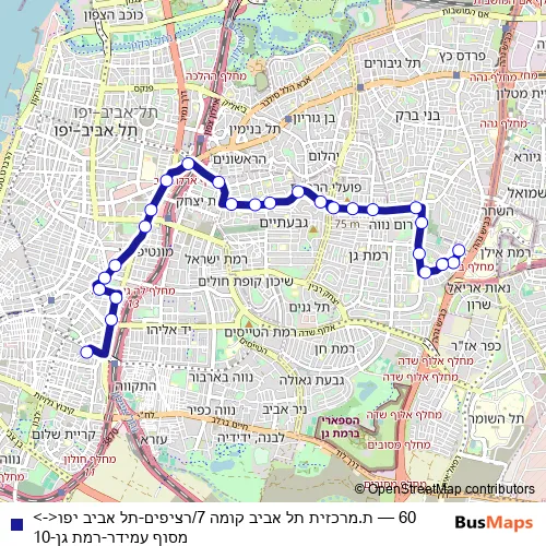 The first stop of the 60 bus route is מסוף עמידר and the last stop is ת.מרכזית תל אביב קומה 7/הורדה. 60 (ת.מרכזית תל אביב קומה 7/רציפים-תל אביב יפו<->מסוף עמידר-רמת גן-10) is operational during כל יום.