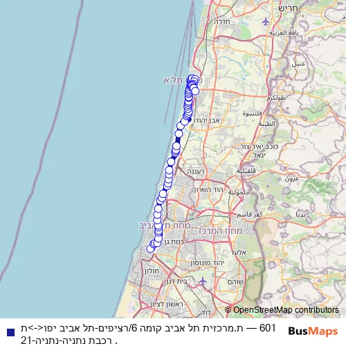 The first stop of the 601 bus route is ת.מרכזית תל אביב קומה 6/רציפים and the last stop is ת. רכבת נתניה. 601 (ת.מרכזית תל אביב קומה 6/רציפים-תל אביב יפו<->ת. רכבת נתניה-נתניה-21) is operational during בסופי שבוע.
