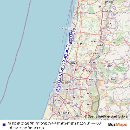 Click here to view the nearest 601 - ת. רכבת נתניה-נתניה<->ת.מרכזית תל אביב קומה 6/הורדה-תל אביב יפו-1# bus stop.