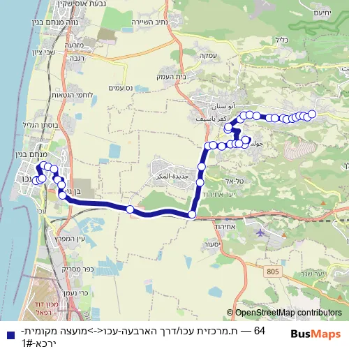 Click here to view the nearest 64 - ת.מרכזית עכו/דרך הארבעה-עכו<->מועצה מקומית-ירכא-1# bus stop.