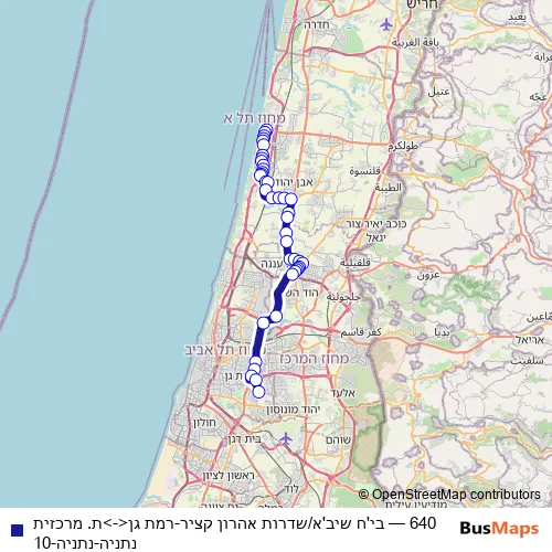 Services on the 640 - בי'ח שיב'א/שדרות אהרון קציר-רמת גן<->ת. מרכזית נתניה-נתניה-10 bus stop at 18:58 on יום שני, יום שלישי, יום רביעי, יום חמישי, יום ראשון.