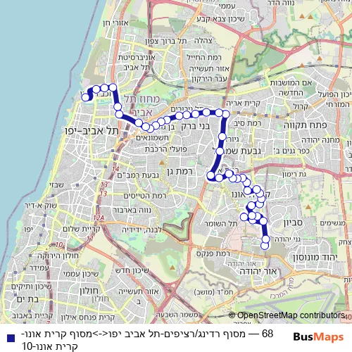 The first stop of the 68 bus route is מסוף קרית אונו and the last stop is מסוף רדינג/הורדה. 68 (מסוף רדינג/רציפים-תל אביב יפו<->מסוף קרית אונו-קרית אונו-10) is operational during כל יום.