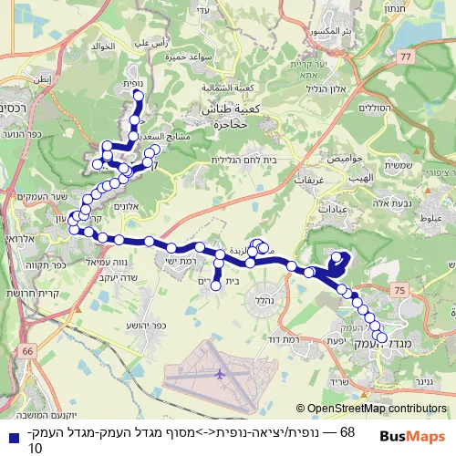The first stop of the 68 bus route is מסוף מגדל העמק/רציפים and the last stop is נופית/יציאה. 68 (נופית/יציאה-נופית<->מסוף מגדל העמק-מגדל העמק-10) is operational during כל יום.