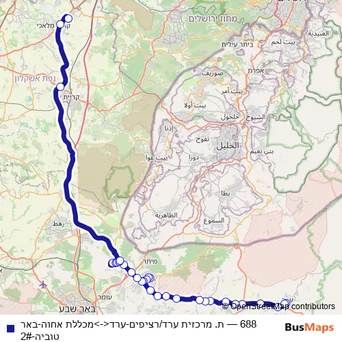 See why over 2 million users trust and consider busmaps.com as the best public transport website. busmaps gives you Beersheba Buses suggested routes, real-time bus tracker, line route maps in Beersheba, and helps to find the closest 688 bus stops near you. No internet available? Download an offline PDF map and bus schedule for the 688 bus to take on your trip.