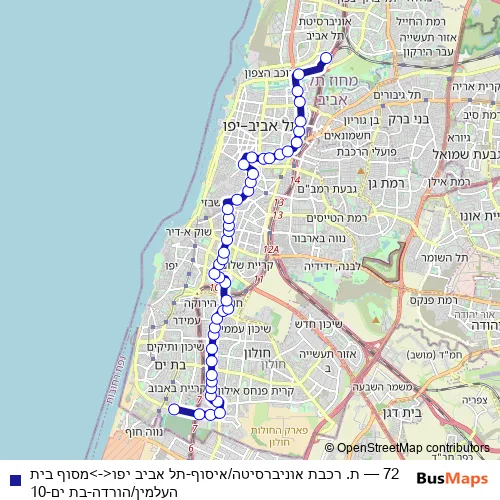 Bus 72 - ת. רכבת אוניברסיטה/איסוף-תל אביב יפו<->מסוף בית העלמין/הורדה-בת ים-10 Schedule in Tel Aviv