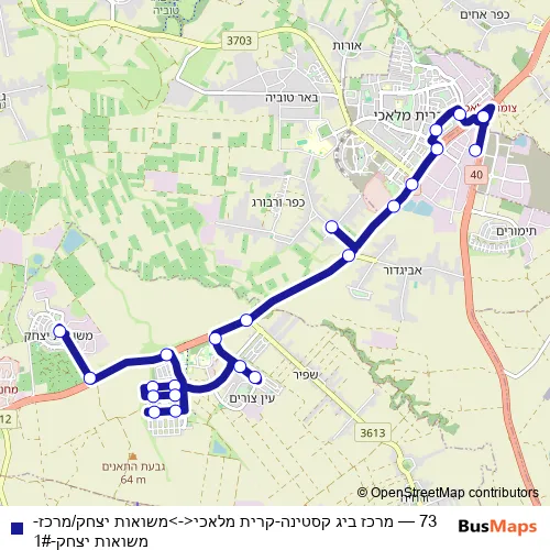 The first stop of the 73 bus route is מרכז ביג קסטינה and the last stop is משואות יצחק/מרכז. 73 (מרכז ביג קסטינה-קרית מלאכי<->משואות יצחק/מרכז-משואות יצחק-1#) is operational during כל יום.