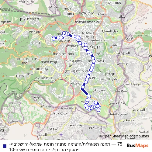 The first stop of the 75 bus route is תחנה תפעולית/היציאה מחניון חומת שמואל and the last stop is מסוף הר נוף/בית הדפוס. 75 (תחנה תפעולית/היציאה מחניון חומת שמואל-ירושלים<->מסוף הר נוף/בית הדפוס-ירושלים-10) is operational during כל יום.