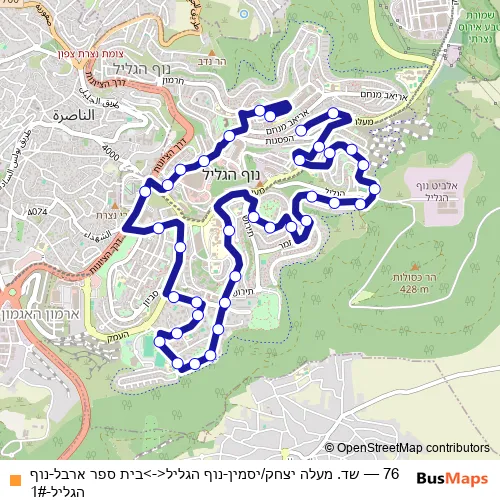 The first stop of the 76 bus route is בית ספר ארבל and the last stop is יסמין/הפסגות. 76 (שד. מעלה יצחק/יסמין-נוף הגליל<->בית ספר ארבל-נוף הגליל-1#) is operational during כל יום.