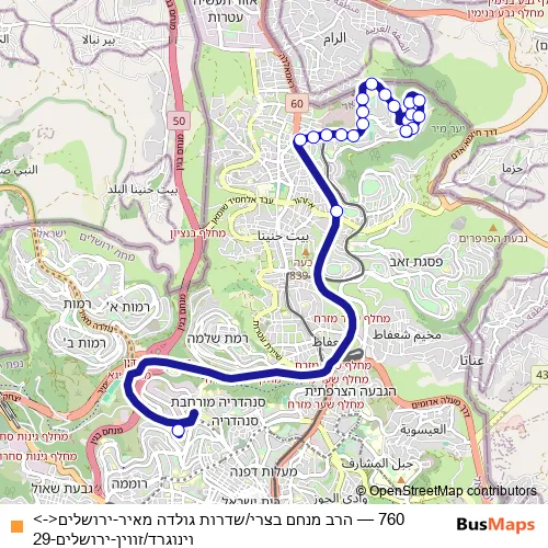 The first stop of the 760 bus route is הרב מנחם בצרי/שדרות גולדה מאיר and the last stop is וינוגרד/זווין. 760 (הרב מנחם בצרי/שדרות גולדה מאיר-ירושלים<->וינוגרד/זווין-ירושלים-29) is operational during כל יום.