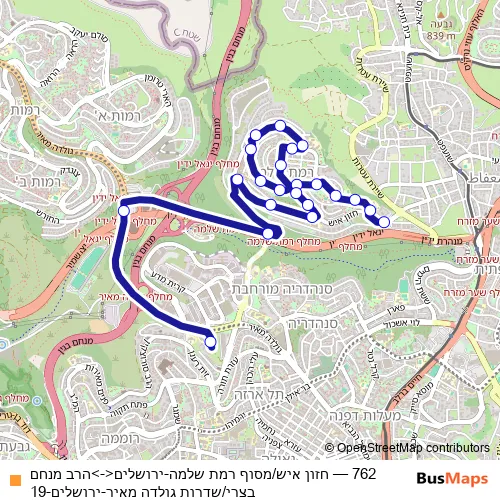 The first stop of the 762 bus route is חזון איש/מסוף רמת שלמה and the last stop is הרב מנחם בצרי/שדרות גולדה מאיר. 762 (חזון איש/מסוף רמת שלמה-ירושלים<->הרב מנחם בצרי/שדרות גולדה מאיר-ירושלים-19) is operational during כל יום.