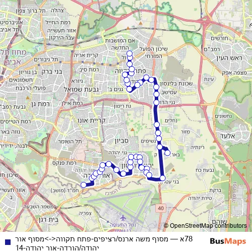 See why over 2 million users trust and consider busmaps.com as the best public transport website. busmaps gives you Tel Aviv Buses suggested routes, real-time bus tracker, line route maps in Tel Aviv, and helps to find the closest 78א bus stops near you. No internet available? Download an offline PDF map and bus schedule for the 78א bus to take on your trip.