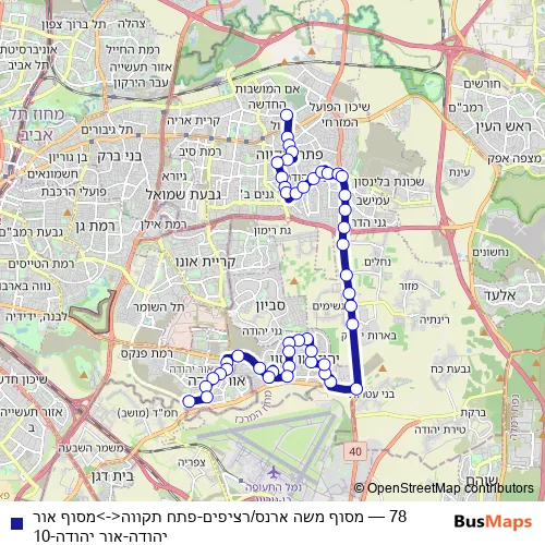 The first stop of the 78 bus route is מסוף משה ארנס/רציפים and the last stop is מסוף אור יהודה/הורדה. 78 (מסוף משה ארנס/רציפים-פתח תקווה<->מסוף אור יהודה-אור יהודה-10) is operational during כל יום.