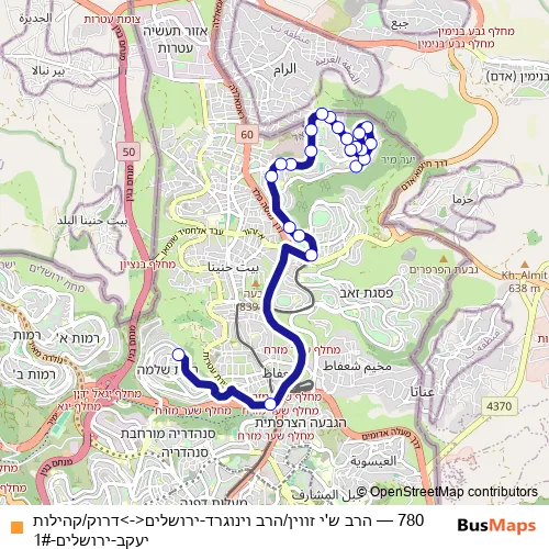 The first stop of the 780 bus route is הרב ש'י זווין/הרב וינוגרד and the last stop is דרוק/קהילות יעקב. 780 (הרב ש'י זווין/הרב וינוגרד-ירושלים<->דרוק/קהילות יעקב-ירושלים-1#) is operational during כל יום.