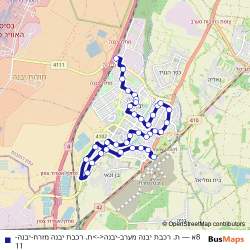 The first stop of the 8א bus route is ת. רכבת יבנה מערב and the last stop is ת. רכבת יבנה מזרח. 8א (ת. רכבת יבנה מערב-יבנה<->ת. רכבת יבנה מזרח-יבנה-11) is operational during כל יום.