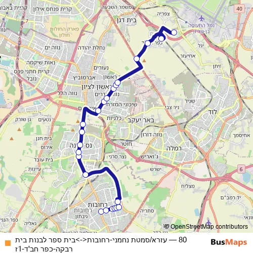 The first stop of the 80 bus route is עזרא/סמטת נחמני and the last stop is בית ספר לבנות בית רבקה. 80 (עזרא/סמטת נחמני-רחובות<->בית ספר לבנות בית רבקה-כפר חב'ד-1ז) is operational during כל יום.
