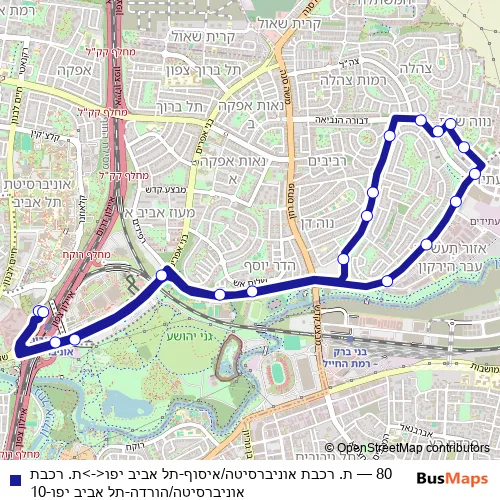The first stop of the 80 bus route is ת. רכבת אוניברסיטה/איסוף and the last stop is ת. רכבת אוניברסיטה/הורדה. 80 (ת. רכבת אוניברסיטה/איסוף-תל אביב יפו<->ת. רכבת אוניברסיטה/הורדה-תל אביב יפו-10) is operational during כל יום.